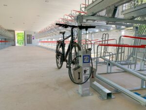 该型号的站点可以配备移动安装底板——热浸镀锌。这种解决方案使得在营业时间内,例如在餐厅、自行车服务点、旅游信息中心等地方提供站点变得更加便捷。您无需将站点永久安装在地面上;相反,您可以将其放置在移动底板上,并使用钢绳和挂锁将其固定在现有的坚固元素上。