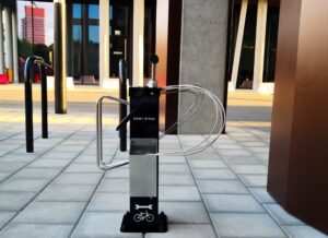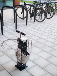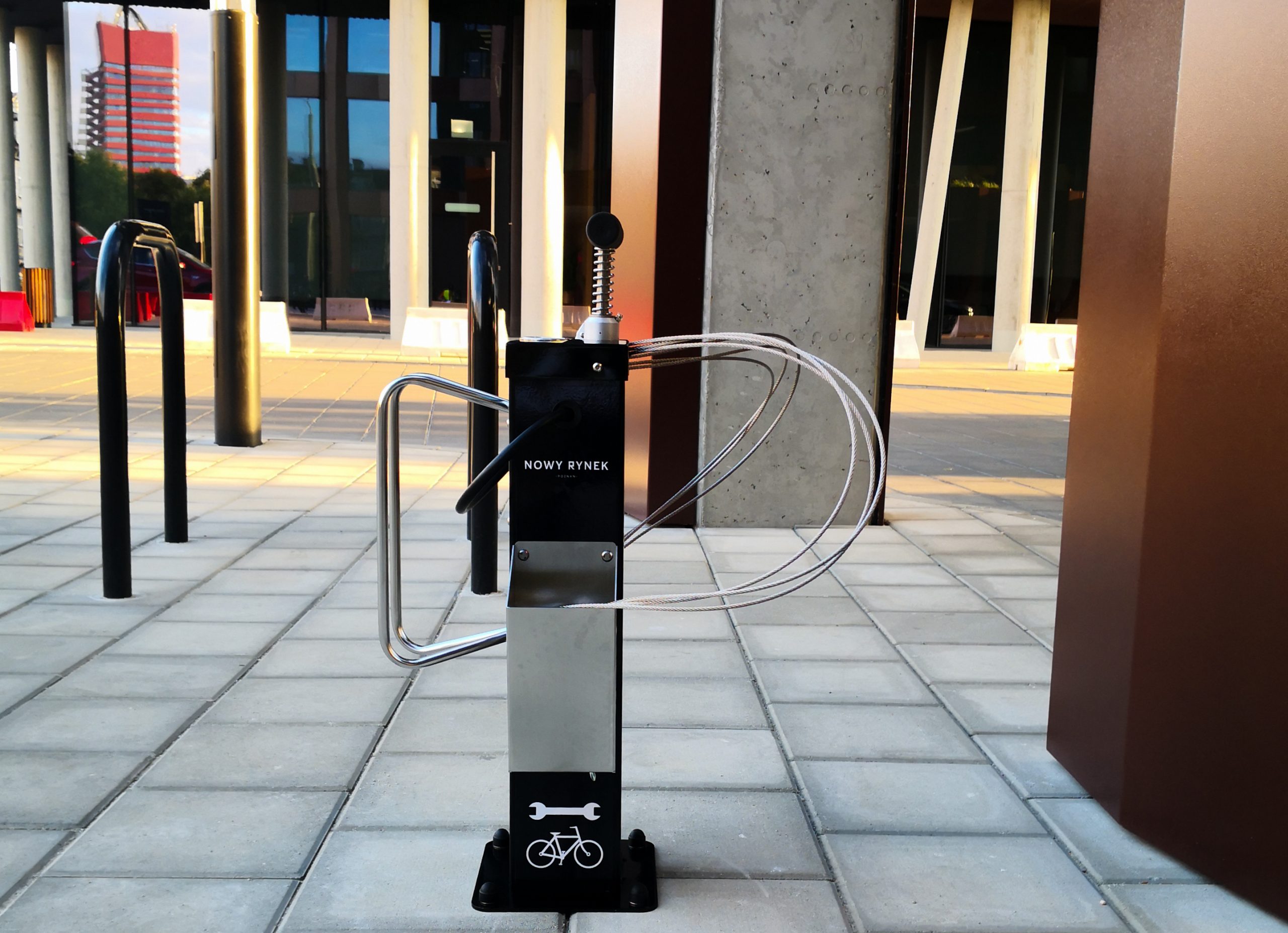 设备外壳由镀锌钢或不锈钢(AISI 304)型材制成,采用粉末涂层。我们还提供该型号的独特版本——拉丝INOX不锈钢(AISI 304)。设备通过锚固装置安装到地面或墙壁上。工具通过不锈钢绳索从站点柱体延伸出来。站点配备了带适配器的手动泵,适用于所有类型的气门嘴。设备的金属板组件采用防盗螺丝固定——螺丝的专用工具将交给客户使用。站点上的二维码可以让用户访问包含自行车故障修复说明的在线资料。